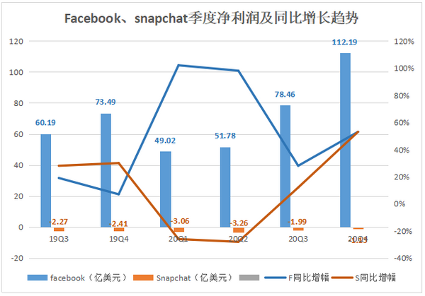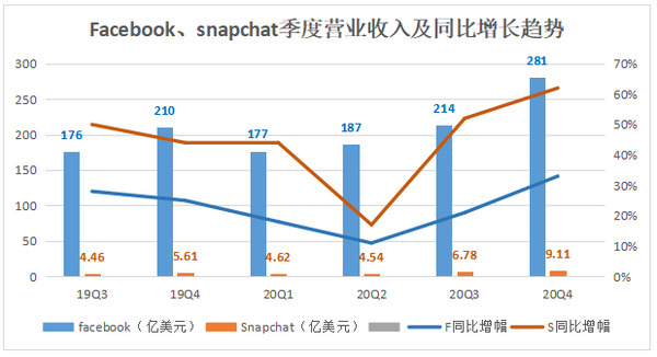 对比来看,Facebook Q4营收281亿美金,同比增长33%,并且在过去的两年里,Snap的营收增速一直保持领先势态。从营收规模来看,两者的差距相当大,这说明FB更受广告主的偏爱。