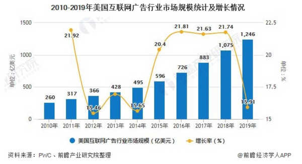从美国整个互联网广告行业市场来看,从2010年到2019年,美国互联网广告规模呈现出上升的趋势,2019年,美国互联网广告市场规模为1246亿美元,同比增长15.91%,2010-2019年年均复合增长率达19.02%,预计2020年会保持增长趋势。