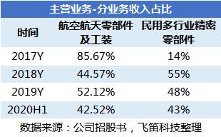 民用多行业精密零部件,主要产品包括精密结构件和电子控制类产品,以精密结构件为主。该业务是公司航空航天领域积累的核心技术在汽车、电子、通信等领域的拓展。2017年至2019年,该业务分别实现收入1479万元、9869万元、1.07亿元,增速快。