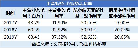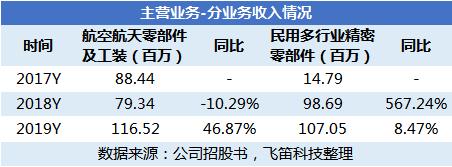 公司解释,2018年,受军改的影响,航空航天零部件及工装的客户验收进度受到影响,客户合同签订时间周期相对较长,导致2018年确认的受托加工收入略低于2017年。2019年,航空航天零部件及工装业务增速明显,主要是公司新增了飞机装配工装产品的销售业务,当年实现收入3116万元。公司表示,飞机装配工装产品的成功交付,是公司军工业务从零部件受托加工向整体产品制造的拓展,这将成为公司未来的重要业绩增长点。