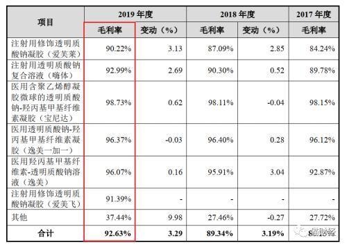 在爱美客的产品体系中,不论是定位高端的宝尼达,还是价格更为亲民的爱芙莱、嗨体等产品,全线毛利率均能达到90%以上,以至于2019年公司综合毛利率高达92%。