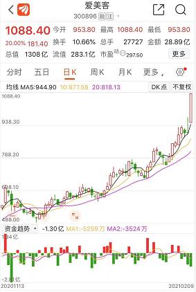 2月9日,医美龙头爱美客(300896)高开高走,盘中大幅拉升,午后涨停股价报1088.4元,再创上市以来新高,市值达1308亿元。目前,爱美客股价仅次于贵州茅台、石头科技,位列两市第三高价股,也是目前两市三只千元股之一。