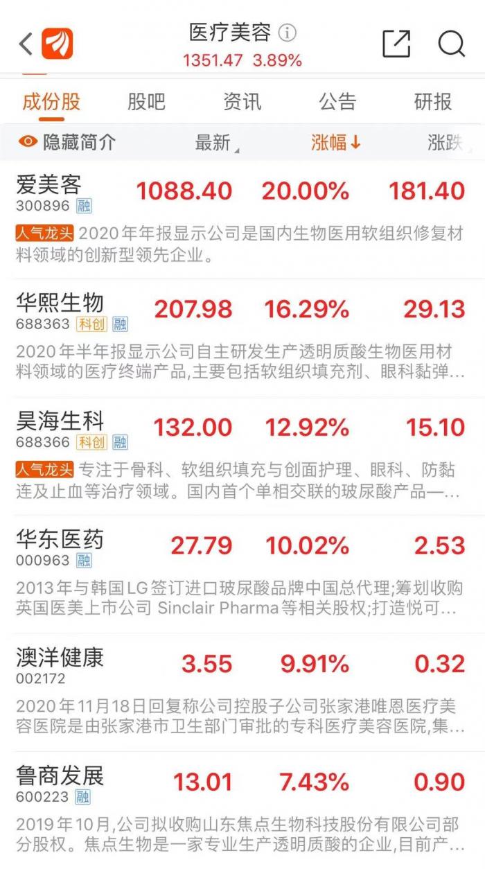 同时,在爱美客的带动下,医美概念股盘中拉升。华熙生物、昊海生科、华东医药等行业公司也纷纷走强。