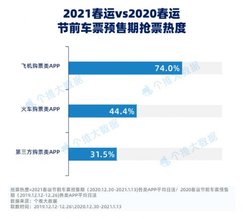 2021年铁路春运自1月28日开始,共计40天。数据显示,2021春运节前预售期间火车购票类APP的活跃度较去年同期下降明显。据官方报道,受疫情影响,2021春运火车票预售较往年同期下降近6成。交通运输部预计2021年全国春运期间约有17亿人次左右,日均4000万人次,比2019年疫情前下降四成多。“原年人”群体可见其规模庞大。