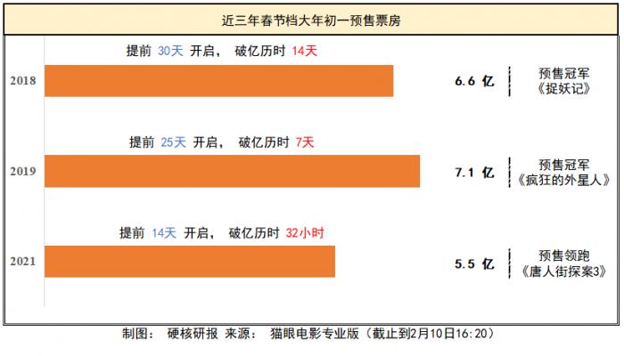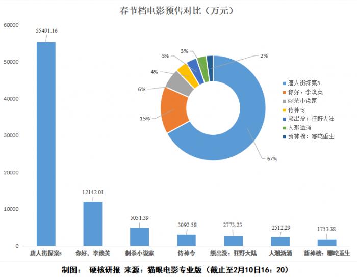 截至2月10日12时,据猫眼专业版实时数据,距离春节档上映仅剩2天,春节档实时预售总票房突破8亿。其中《唐探3》超5亿独占档期票房超六成。第二名《你好,李焕英》达1.21亿。第三名《刺杀小说家》超过5000万。