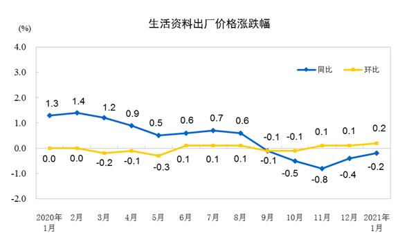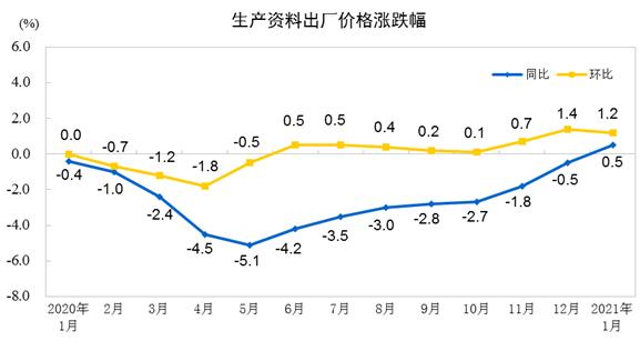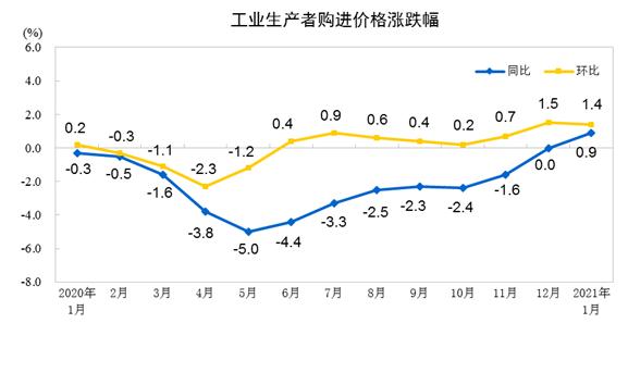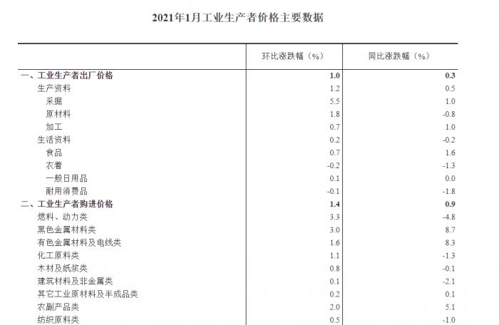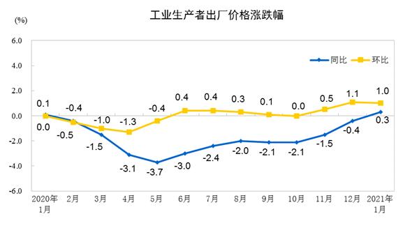 2021年1月份,全国工业生产者出厂价格同比上涨0.3%,环比上涨1.0%;工业生产者购进价格同比上涨0.9%,环比上涨1.4%。