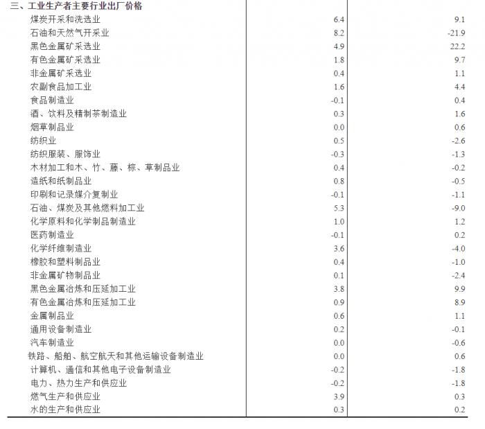 主要行业中,价格涨幅扩大的有黑色金属冶炼和压延加工业,上涨9.9%,扩大4.9个百分点;煤炭开采和洗选业,上涨9.1%,扩大7.8个百分点;有色金属冶炼和压延加工业,上涨8.9%,扩大0.6个百分点。价格降幅收窄的有石油和天然气开采业,下降21.9%,收窄5.1个百分点;石油、煤炭及其他燃料加工业,下降9.0%,收窄3.5个百分点。此外,化学原料和化学制品制造业价格由持平转为上涨1.2%。