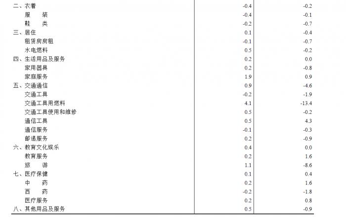 其他七大类价格一涨两平四降。其中,医疗保健价格上涨0.4%;生活用品及服务、教育文化娱乐价格均持平;交通通信、其他用品及服务价格分别下降4.6%和0.9%,居住、衣着价格分别下降0.4%和0.2%。
