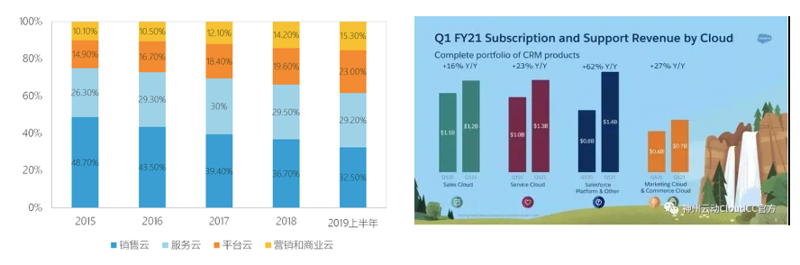 2020年初,尽管疫情爆发、蔓延使得恐慌情绪一度重创了美股,但Salesforce却表现不俗。2021财年一季度(2020年2-4月)财报显示,Salesforce本季营收48.7亿美元,同比增长30%。更值得关注的是,这季度公司最赚钱的业务不再是销售云,而是平台业务。平台业务自2015年以来一直持续增长,本季度更是以13.64亿美元,同比增长62%的成绩一跃成为公司营收的新主力(如下图所示)。