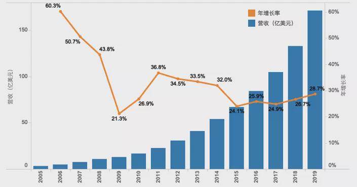 2020年12月初,软件即服务SaaS巨头Salesforce发布了2021财年三季度(2020年8-10月)财报,该季度营收54.19亿美元,同比增长20%;净利润10.81亿美元,而去年同期净亏损1.09亿美元,2020全年营收有望突破200亿美元。年营收从10亿到100亿美元,Salesforce花了近10年,从100亿到200亿美元,估计只用3年,年增长率连续15年保持在20%以上(如下图所示)。