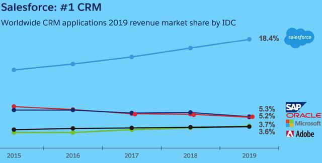 尽管Salesforce在CRM市场上大幅领先,但2019年其股价涨幅为18%,明显低于软件行业平均41%的涨幅。