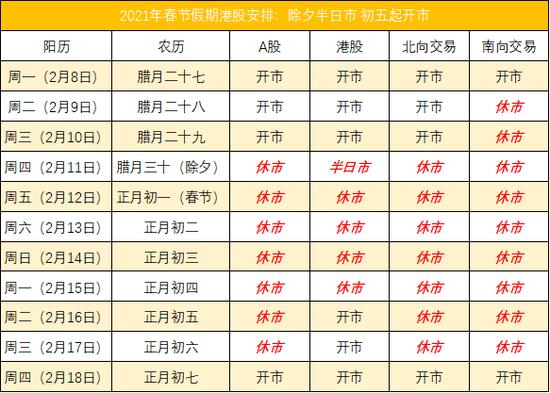 港股除夕(2月11日)上午开市,下午休市,正月初五(2月16日)起恢复正常交易。