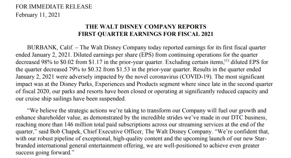 公司披露,第一财季营收162.49亿美元,同比下降22%,但依然稳稳超过分析师平均预期的159亿美元;调整后EPS 32美分同样显著好于市场预期的亏损41美分。受财报数据拉动,周四刚刚创下股价历史新高的迪士尼盘后涨逾2%。