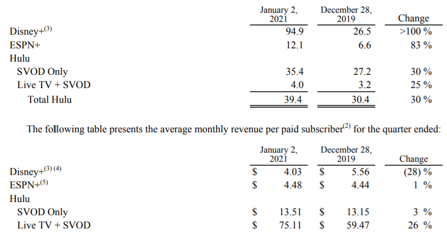 从具体业务层面来看,迪士尼流媒体依然是近一年来市场最为关心的板块。公司披露直接面对消费者事业(Direct-to-Consumer)在报告期内营收同比大增73%至35亿美元,亏损也从去年同期的11亿美元收窄至4.66亿美元。其中迪士尼+业务付费订阅人数达到9490万人,去年同期为2650万人;该业务平均月付费用户营收从5.56美元下滑至4.03美元的原因是迪士尼在印尼和印度推出价格更低的Disney+ Hotstar拉低了平均数据。ESPN+和Hulu的各项数据均保持正增长。