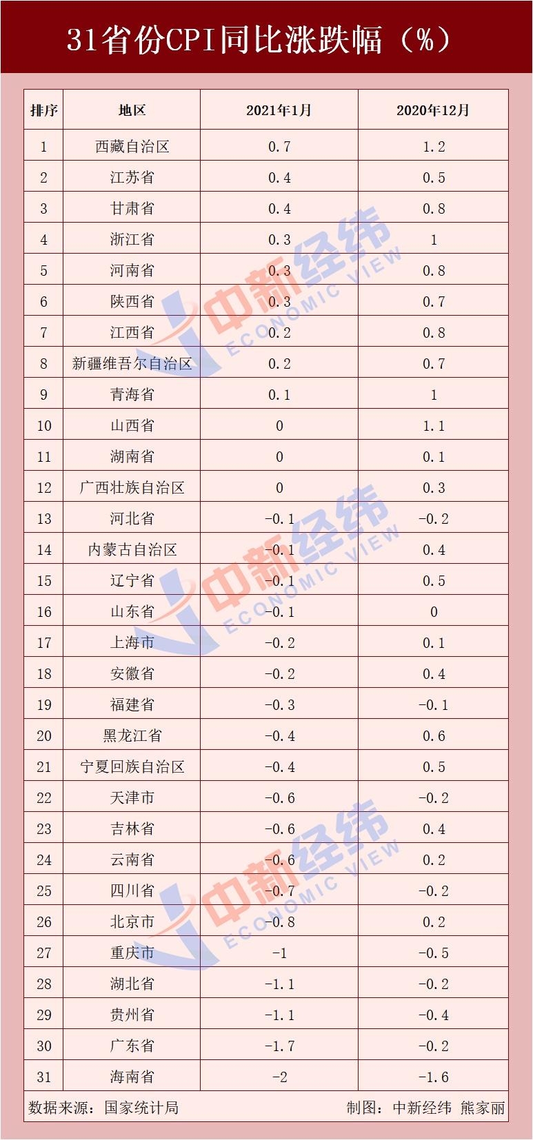 国家统计局11日公布了31省份2021年1月居民消费价格指数(CPI),数据显示,19个省份1月CPI同比负增长,海南再度成为跌幅最大的省份,降幅达2%;9省份CPI同比上涨,西藏以0.7%领涨全国;此外,山西、湖南、广西三省份CPI涨幅为0。