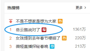 微博热搜榜上出现了“岳云鹏说对了”的词条,并且一直上榜就进入了前十。