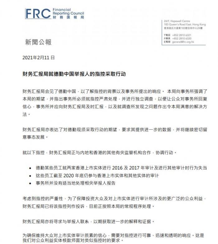 1、香港财务汇报局就有关德勤中国的举报采取行动。