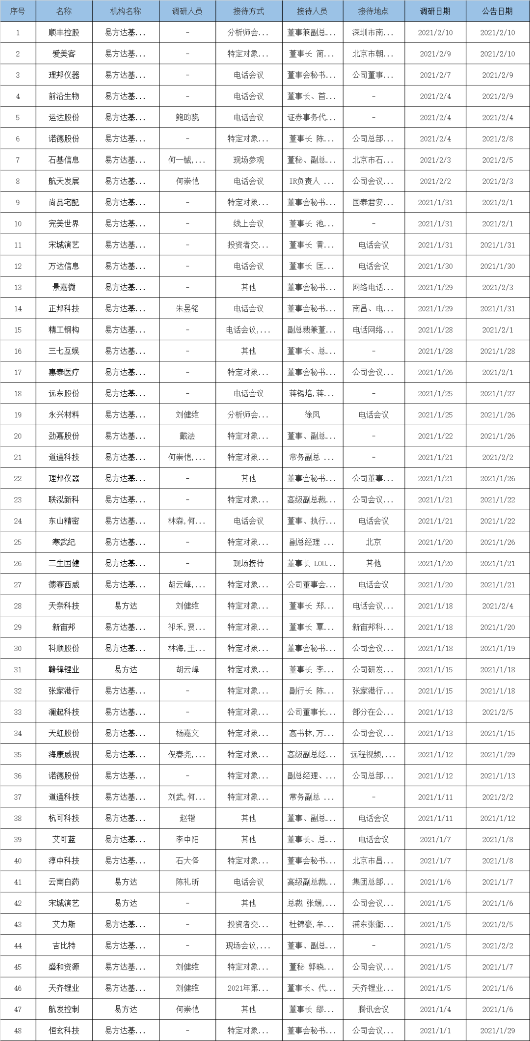 易方达基金2021年调研的重点上市公司包括顺丰控股、石基信息、 航天发展、道通科技、东山精密、德赛西威、海康威视和航发控制。