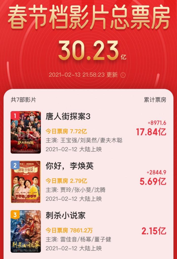 春节档电影票房累计突破30亿元,《唐人街探案3》超17亿元