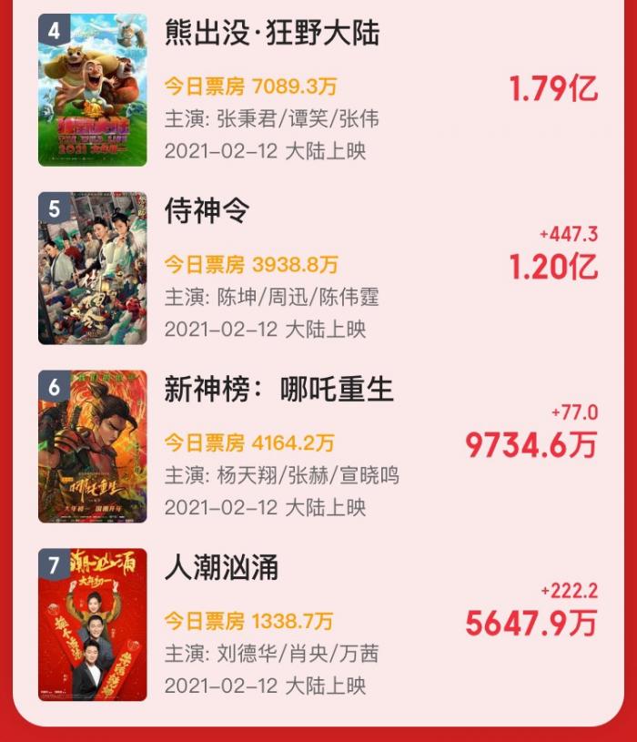 猫眼专业版显示,截至2月13日晚8时,大年初二电影实时票房已超12亿元,累计票房30亿。《唐人街探案3》斩获票房17.84亿元,遥遥领先。《你好,李焕英》累计票房突破5亿元。