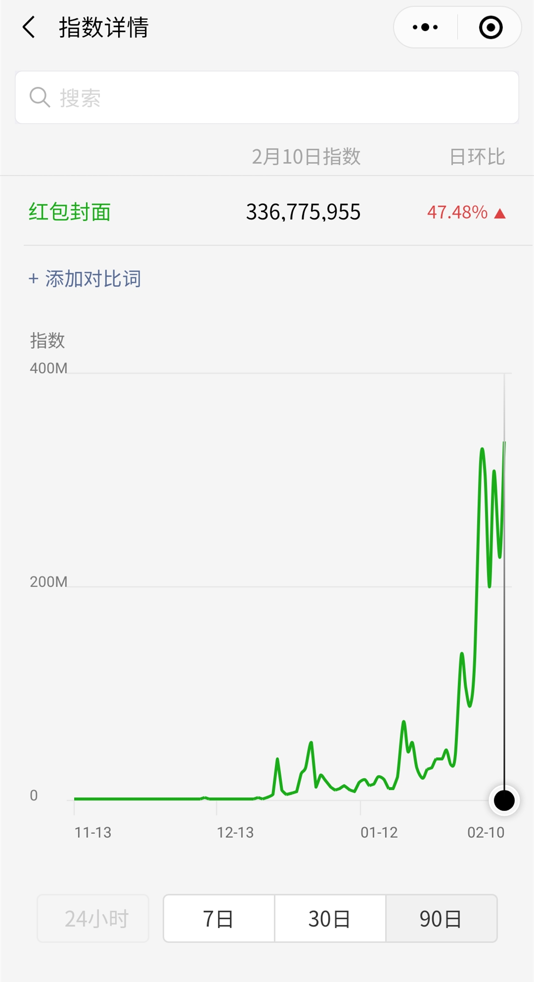 临近过年,微信红包封面越来越热。根据微信官方提供的基于大数据分析的移动端指数“微信指数”小程序显示,自去年底,微信官方对个人用户开放定制红包封面功能以后,大家玩得更欢了。尤其是进入2021年2月,每天都有上千万人通过微信搜索“封面红包”,2月11日的微信指数远超3亿。