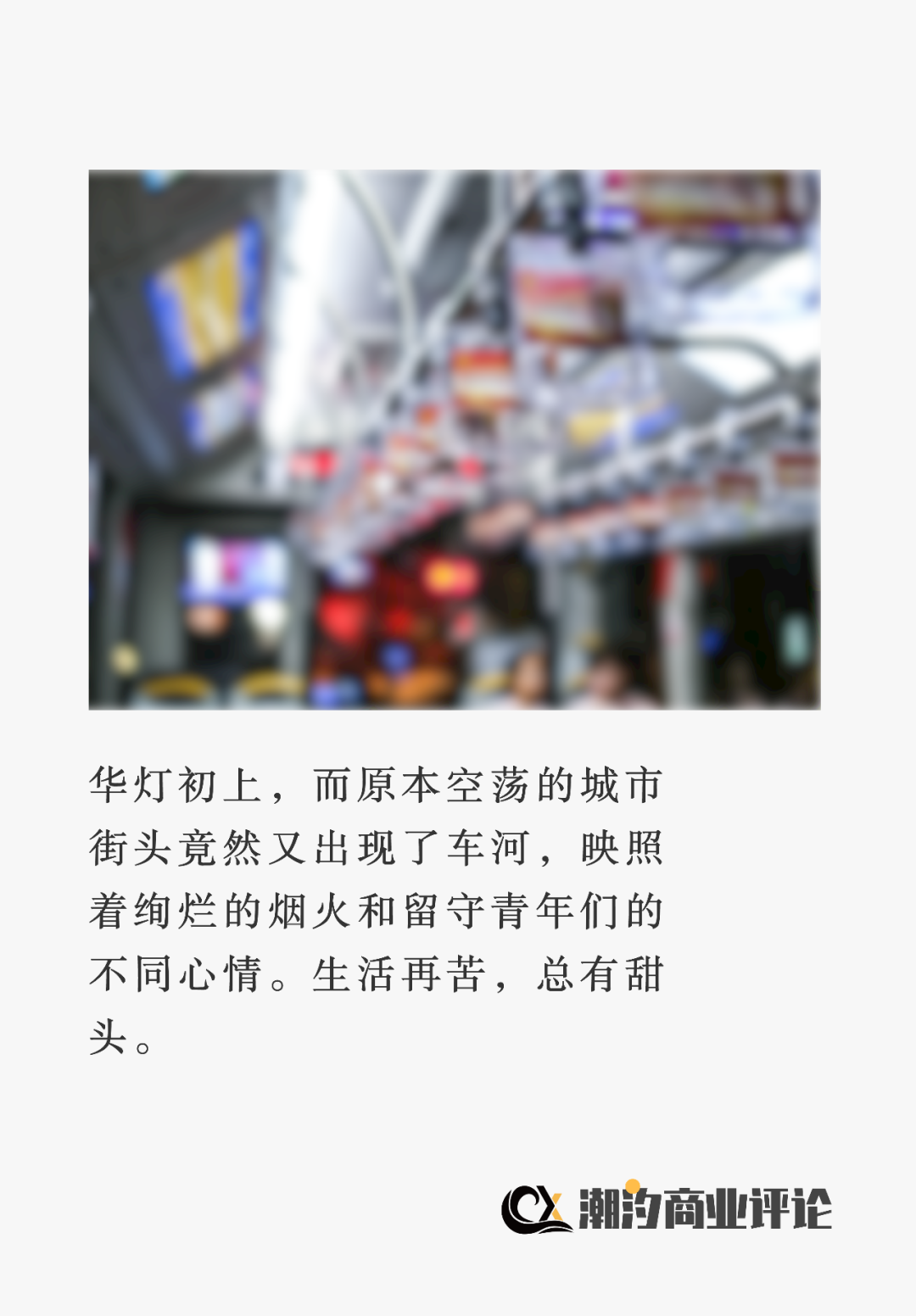 华灯初上,而原本空荡的城市街头竟然又出现了车河,映照着绚烂的烟火和留守青年们的不同心情。他们或是回不去,或是不想回;或是抱团取暖,或是自得其乐;或是足不出户,或是假装远行。生活再苦,总有甜头。