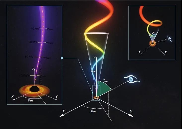 这和研究团队对“慧眼”观测数据的分析结果相反,究竟是为什么?研究团队认为,目前这一现象最合理的解释是:冕在收缩的同时,冕中的等离子体流正在以相对论速度向外运动。这为“慧眼”团队已经发现的离黑洞很近的相对论喷流提供了独立的观测证据和物理解释。进一步研究发现,冕尺度越小,速度越大,因此冕物质运动的相对论性集束效应抑制了黑洞的引力弯曲效应。