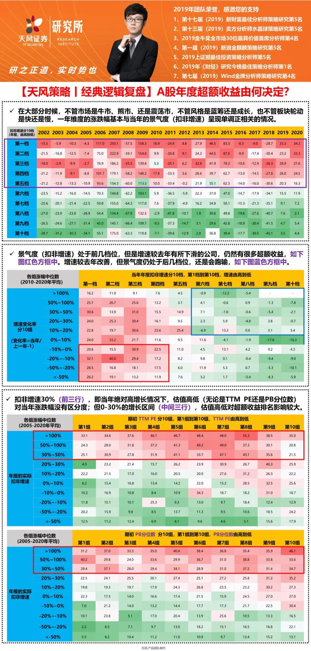 2、对于A股中大部分的炒报表的公司,年度超额收益更多取决于当年扣非增速的高低。即不管市场是牛市、熊市、还是震荡市,不管风格是蓝筹还是成长,也不管板块轮动是快还是慢,一年维度的涨跌幅基本与当年的景气度(扣非增速)呈现单调正相关的情况。(如上图中的图1所示)