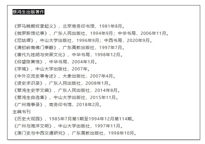 他的离开是我们国内历史学界的一大损失,在岭南更是。我认为他的治学接受了老一辈学者的优秀传统做法(过去我们有“八大教授”,这对老蔡这一辈的学生有很大影响)——把握准确的结论,不会乱说,有些问题写不下去的话,宁愿就不写了,但是他每做一个问题都是认真对待,书并不是很厚,但是所解决的问题非常重要,他的作风也影响了我们中山大学历史系。