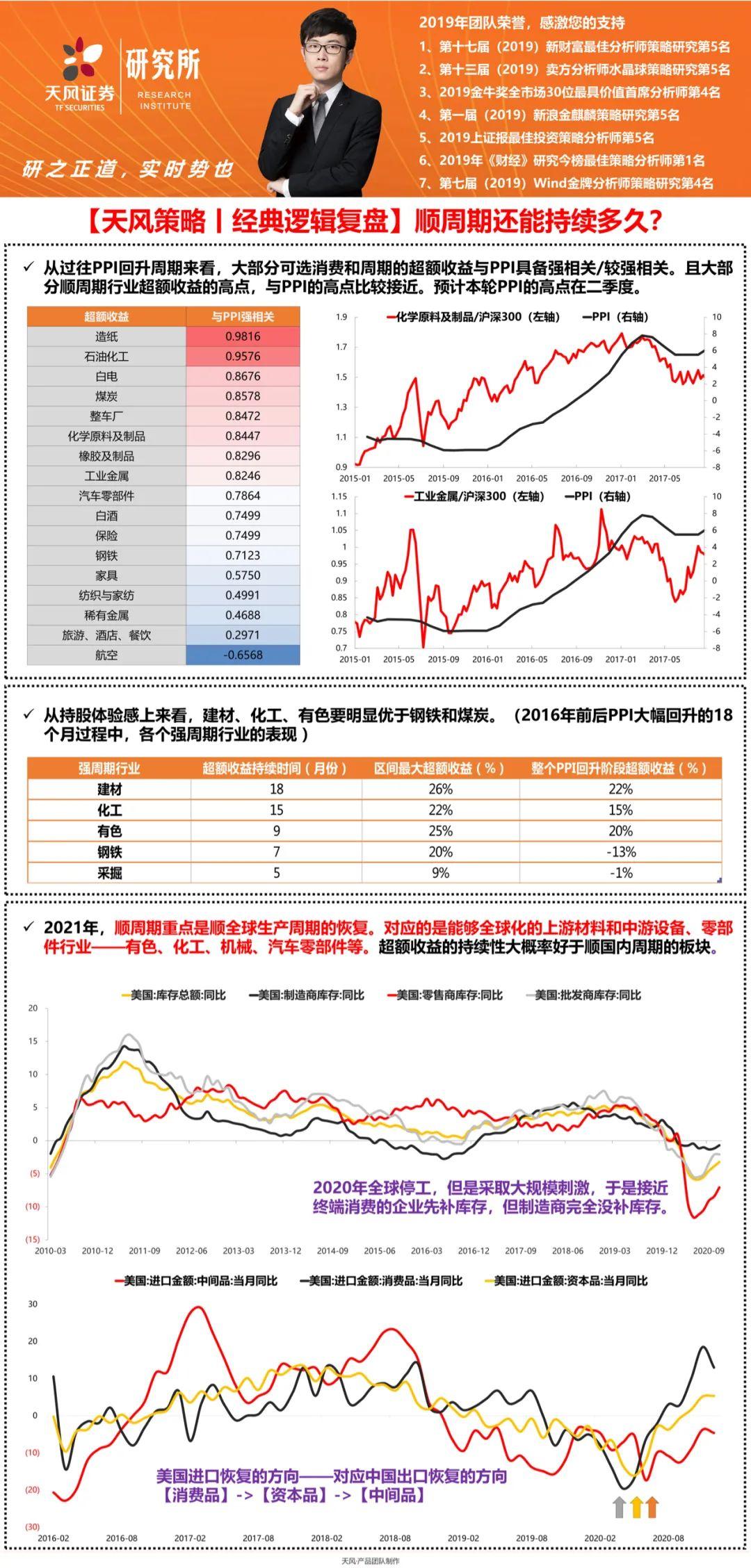 5、2021年,顺周期重点是顺全球生产周期的恢复。对应的是能够全球化的上游材料和中游设备、零部件行业——有色、化工、机械、汽车零部件等。超额收益的持续性大概率好于顺国内周期的板块。