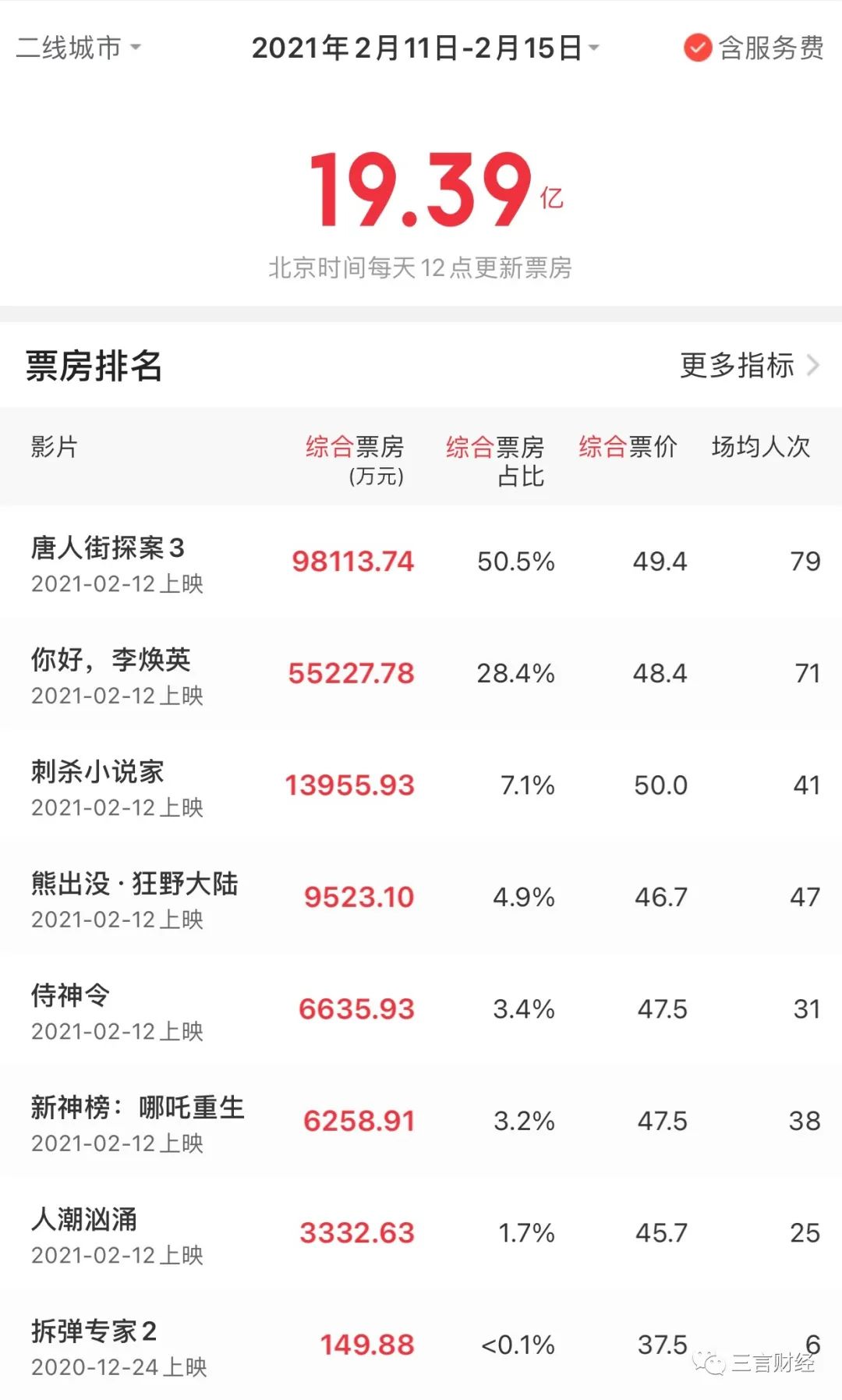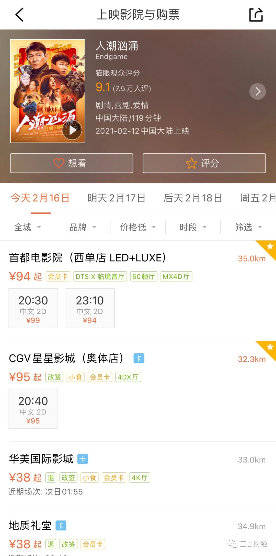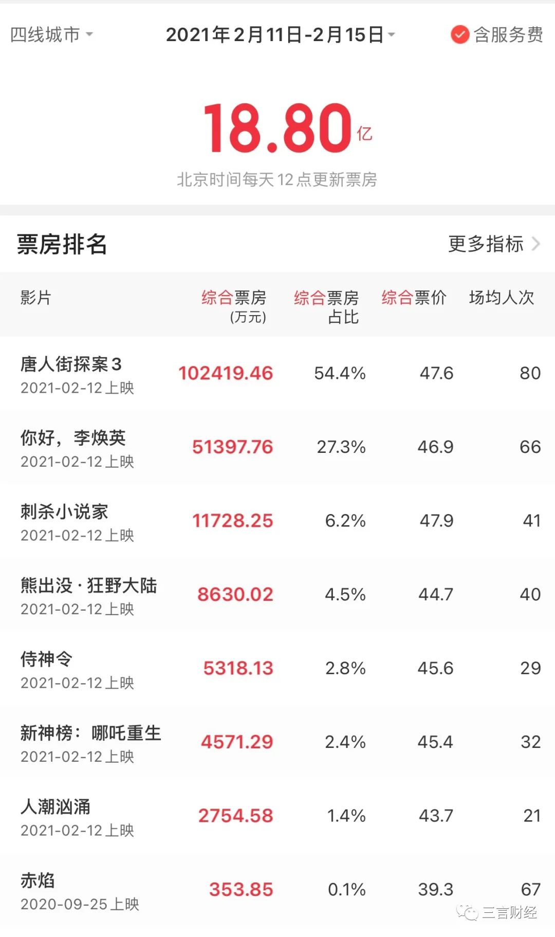 此外,2021年春节还有个特殊因素。即倡导就地过年。很多人选择不回家过年,所以这也在一定程度上导致一线城市电影院票价上涨。