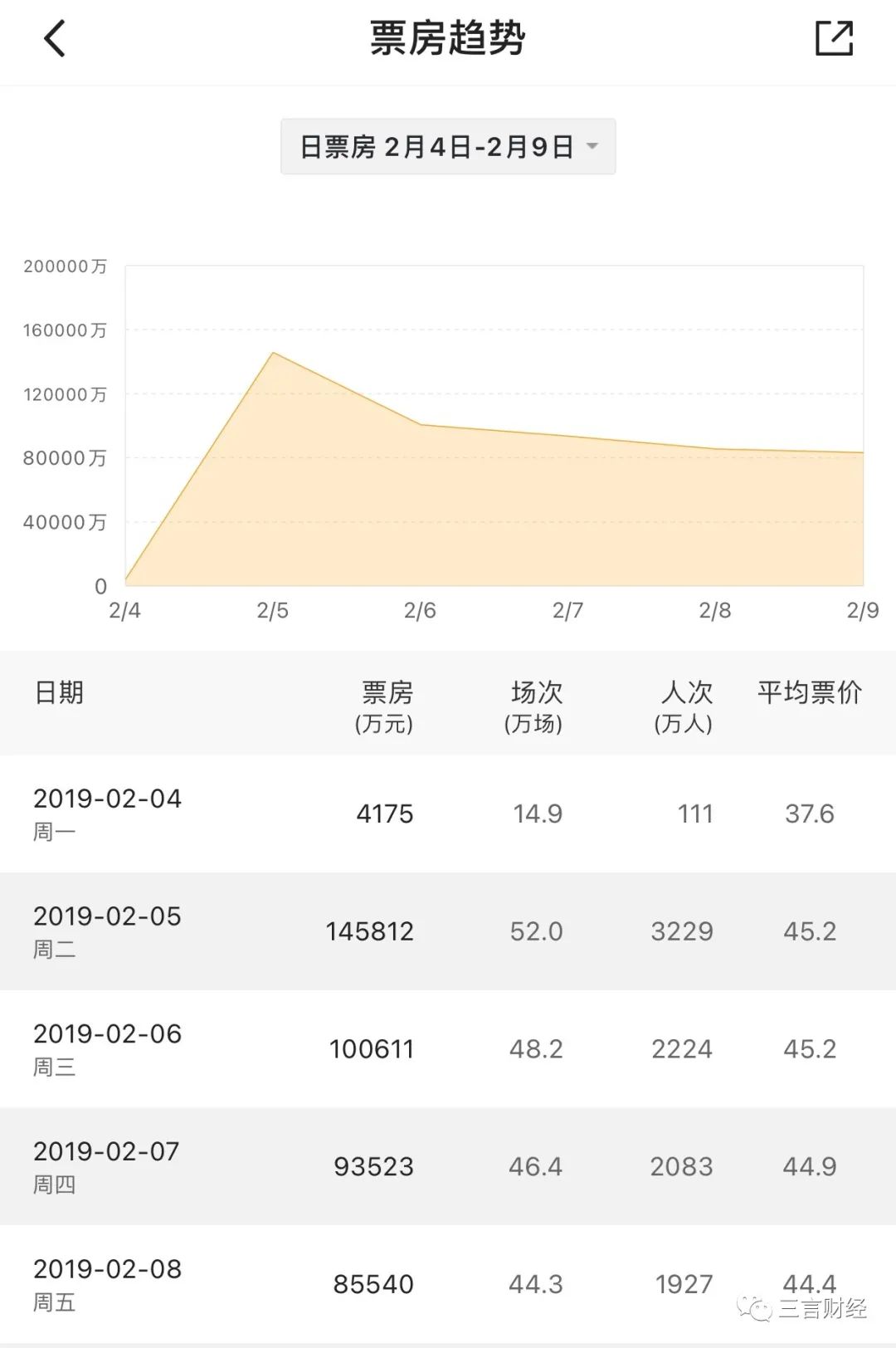 2019年除夕至初四(2019年2月4日至2月8日),全国影院平均票价最低37.6元,最高45.2元。