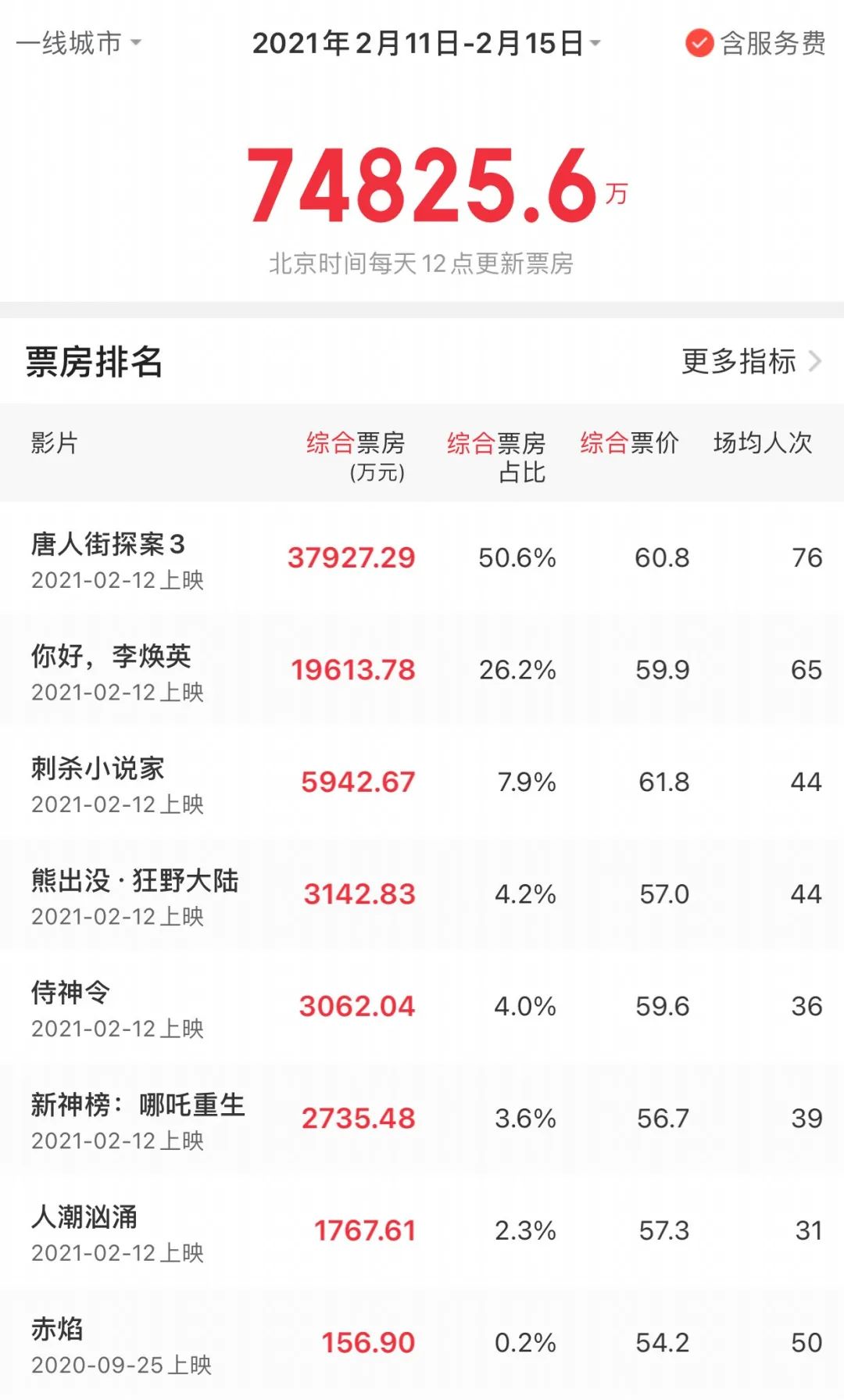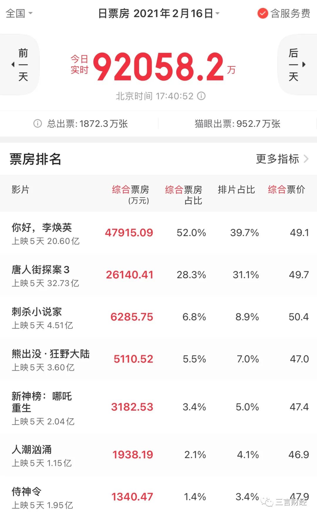 今年春节档虽然有很多质量不错的电影作品,像《唐探3》和《你好,李焕英》,其中,《唐探3》目前总票房已超30亿,并且排片率为31.1%;《你好,李焕英》总票房达到20.60亿元,排片率也高达39.7%。