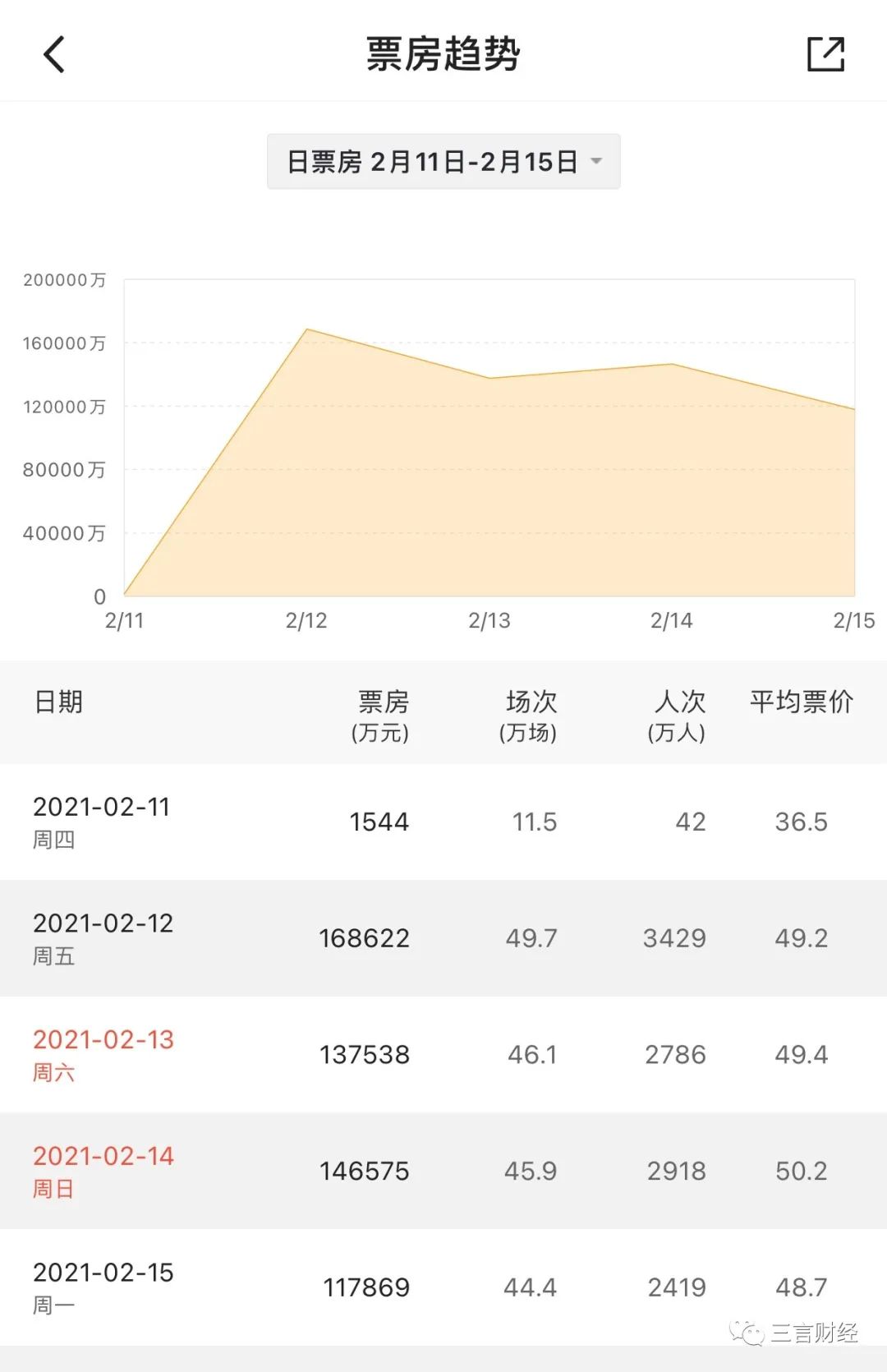 2021年除夕至初四(2021年2月11日至2月15日),全国影院平均票价最低36.5元,最高50.2元;