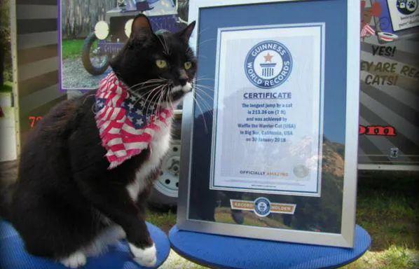 这只猫咪界的跳远冠军叫做勇士猫华夫饼(Waffle the Warrior Cat),它在2018年1月30日美国加利福尼亚州跳出了213.36厘米(7英尺)的成绩。