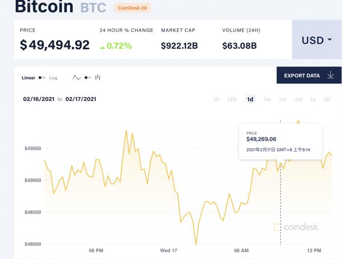 截至北京时间2月17日14点25分,比特币为50032.38美元。