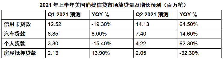 总的来说,随着疫苗的推广、疫情的好转和经济的全面重启,美国消费信贷市场也将2021年全年复苏,其中信用卡贷款和个人贷款的反弹速度将尤其显著。