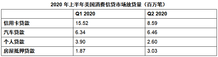 2020年3月新冠疫情在全美的爆发,也对美国消费信贷市场造成了一定的影响。2020年第二季度,美国个人贷款和信用卡贷款等无担保信贷产品的放贷量与2020年一季度相比大幅放缓。