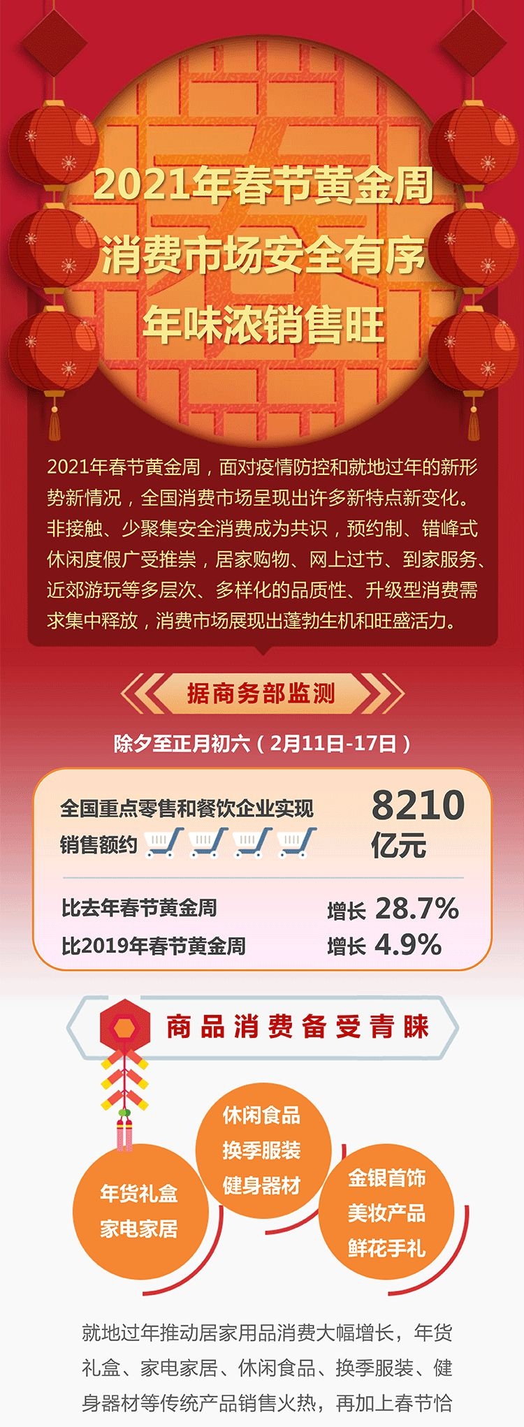 商务部数据显示,11日至17日,全国重点零售和餐饮企业实现销售额约8210亿元,比去年春节黄金周增长28.7%。