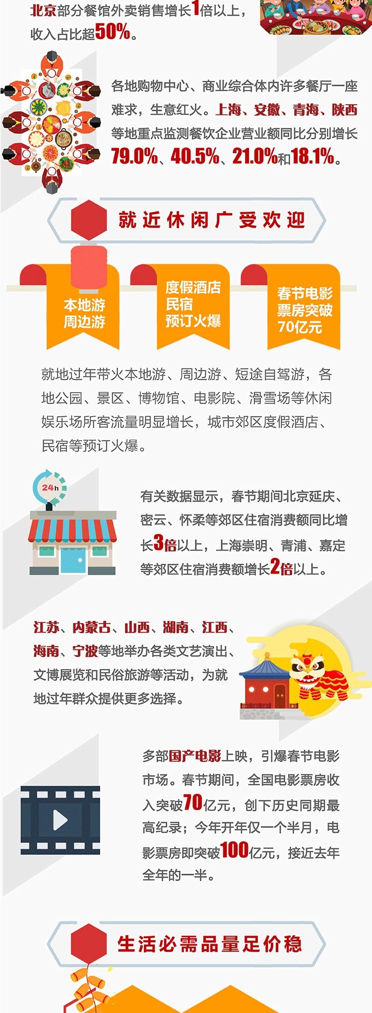 阿里发布报告显示,2021年春节有1亿人“原地过年”。飞猪平台数据显示,牛年春节期间“本地游”预订量同比涨超660%。此外,同程航旅数据显示,假期前六天周边游整体环比涨幅达289%,部分城市周边游同比增长300%以上。饿了么数据显示,春节期间,火锅、奶茶等外卖订单增幅均在2倍及以上。农历廿八至除夕,年夜饭半成品外卖同比增长4倍,单人份外卖订单同比翻一番,在一二线城市中尤为明显。