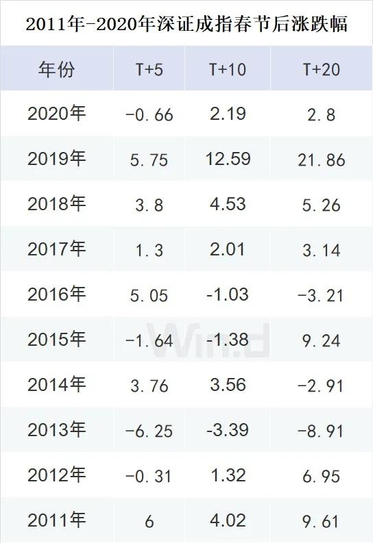 统计最近10年来A股市场在春节后市场表现,节后A股主要股指上涨的概率在6成以上。春节后5个交易日,10个交易日、20个交易日,上证指数的上涨概率(绝对收益为正的年份占比)均达到80%。 从深证成指在最近10年表现看,节后5个交易日上涨概率较低,为60%,在节后10个交易日和20个交易日,上涨概率均为70%。