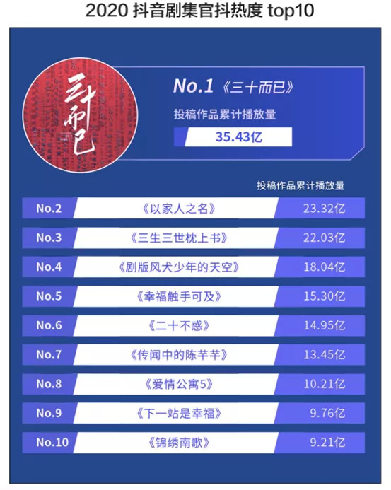 抖音去年官宣超过6亿日活,单个用户日均使用时超过70分钟,是无可撼动的头号“时间杀手”、“国民级别的流量池”,更是长视频剧集营销的关键阵地。光是去年,《三十而已》《以家人之名》《风犬少年的天空》等头部剧集都开设了官抖账号,进行宣发和二次传播,相关投稿视频平均在抖音收获超10亿次播放量,助力几部剧集成为年度爆款。