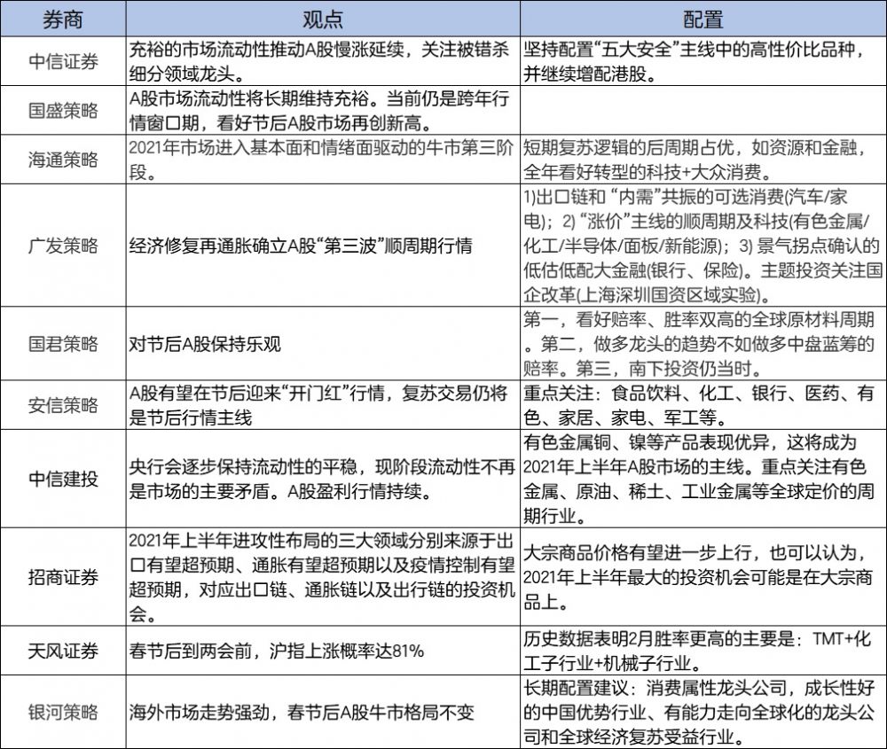 安信策略:春节期间,国内“就地国内”政策催生了史上最强春节档,一线与新一线城市本地游、休闲娱乐、餐饮等服务业复苏明显。海外受益于疫苗接种进程良好,经济复苏预期升温,油价大幅上涨,主要外盘股指全线飘红。从短期看,受益于A股季节效应和全球市场risk on,A股有望在节后迎来“开门红”行情,复苏交易仍将是节后行情主线。