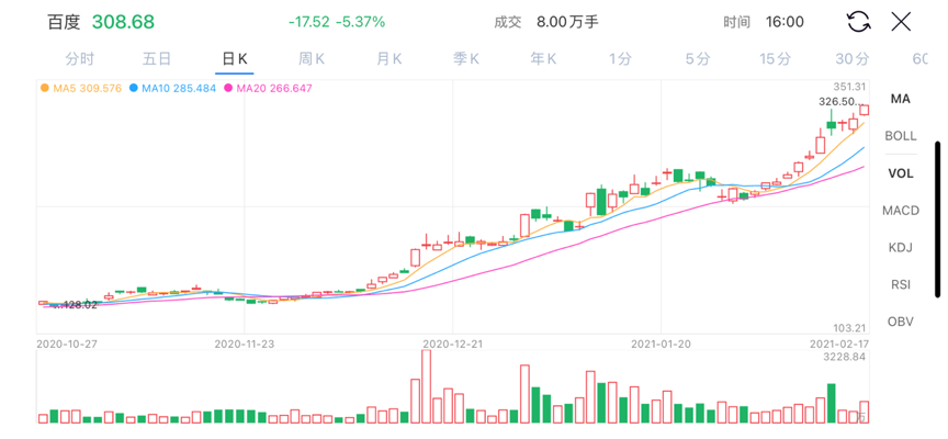 截至2月17日,百度已经连续上涨11个交易日,累计上涨38.8%。这只是百度最近连续上涨的一个小片段。从2020年8月开始,百度已经连续上涨7个月,百度上一次连涨7个月还要回溯到13年前的2007年。