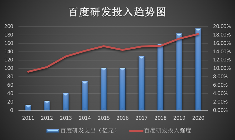 奇偶派从wind数据选取百度从2011年到2020年十年间研发支出,数据分别是:13.34亿元、23.05亿元、41.07亿元、69.81亿元、101.76亿元、101.51亿元、129.28亿元、157.72亿元、183.46亿元、195亿元。