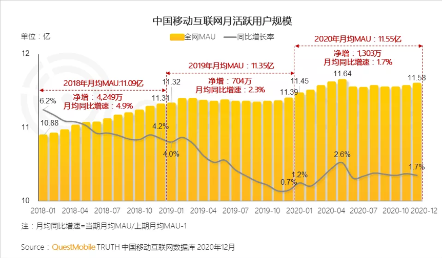 QuestMobile发布的2020中国移动互联网年度大报告数据显示,中国移动互联网流量接近饱和,同比增速持续下滑,月均同比增速从2018年的4.9%下滑到2019年的2.3%,2020年这一数据再度下降到1.7%,移动互联网进入存量竞争时代。