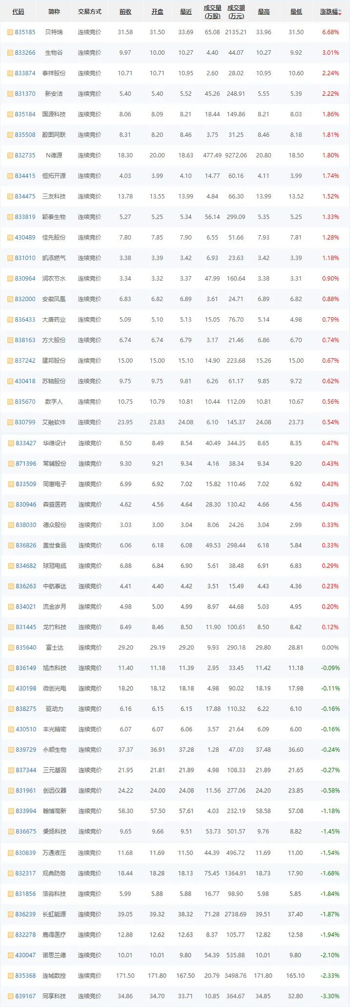 截至2月19日收盘,今日成交金额为6.75亿元,精选层成交金额为2.53亿元,创新层成交金额为2.52亿元,基础层成交金额为1.69亿元;今日成交股数为7711.06万股,精选层成交股数为1407.27万股,创新层成交股数为2824.36万股,基础层成交股数为3479.43万股。