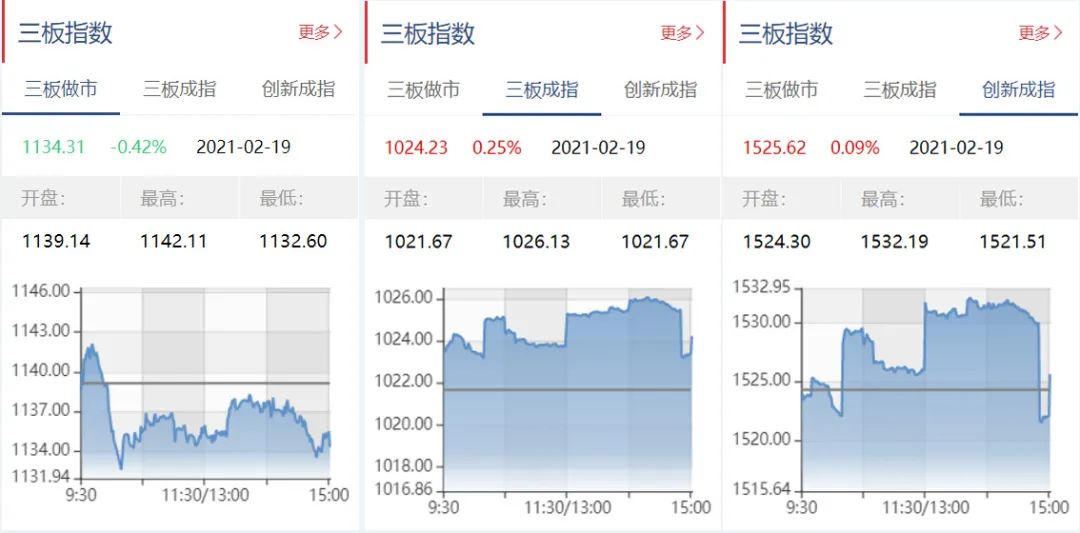 截至2月19日收盘,三板做市报1134.31点,下跌0.42%;三板成指报1024.23点,上涨0.25%;三板创新成指报1525.62点,上涨0.09%。