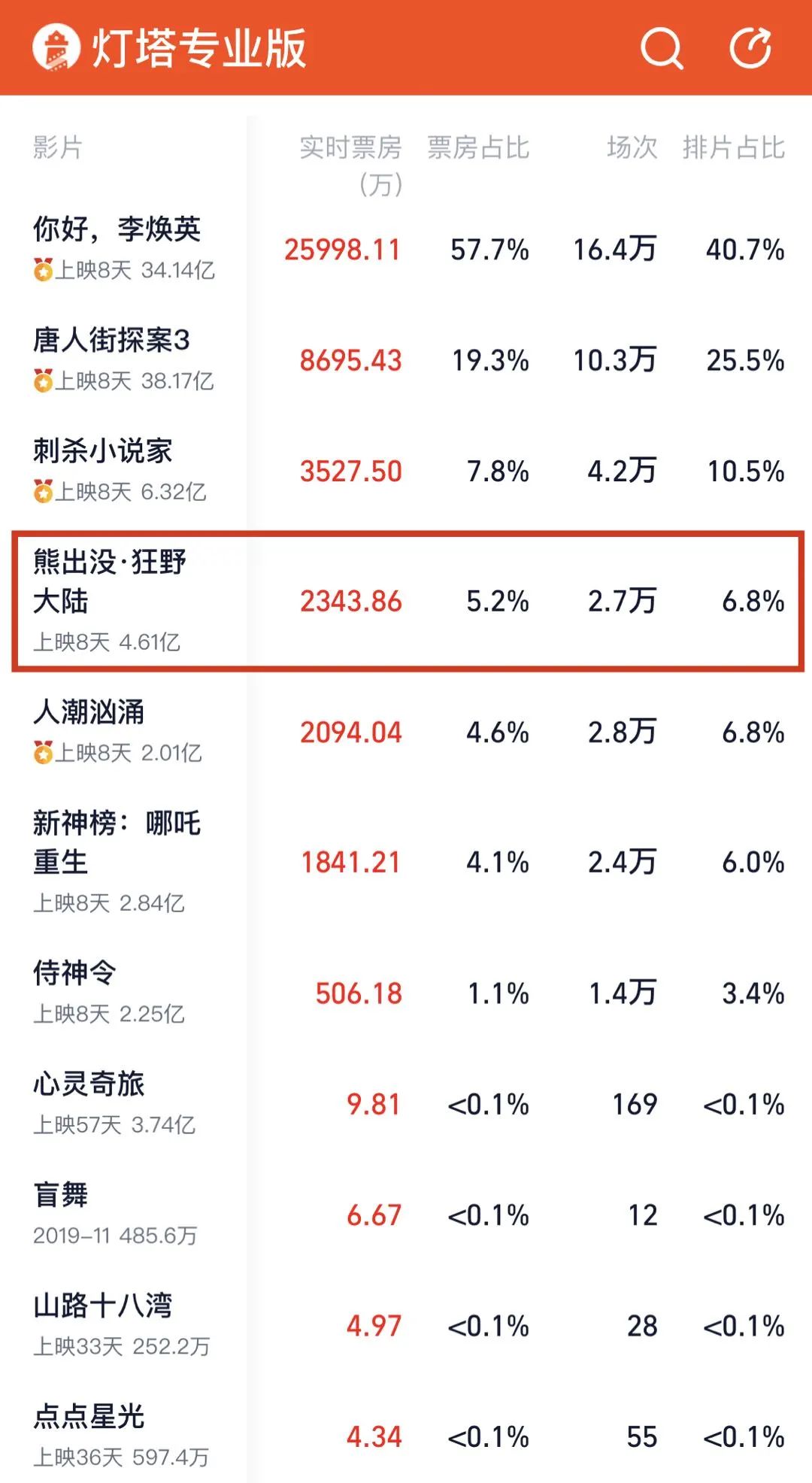 截至2月19日18点30分,华强方特出品的《熊出没·狂野大陆》上映8天票房即达到4.61亿元,在今年春节档电影市场排名稳居第4位。