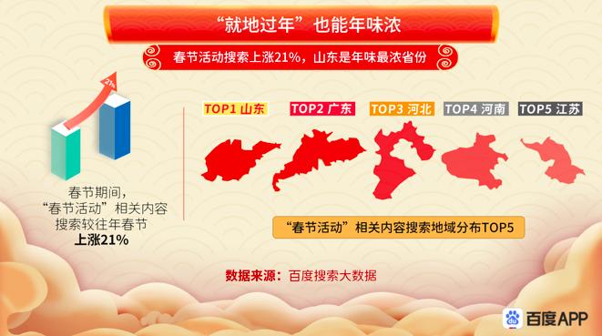 百度搜索大数据显示,今年春节期间,发红包、压岁钱、贴春联等“春节活动”相关内容的搜索较往年春节上涨 21%,山东、广东、河北成为最具年味的三大省份。